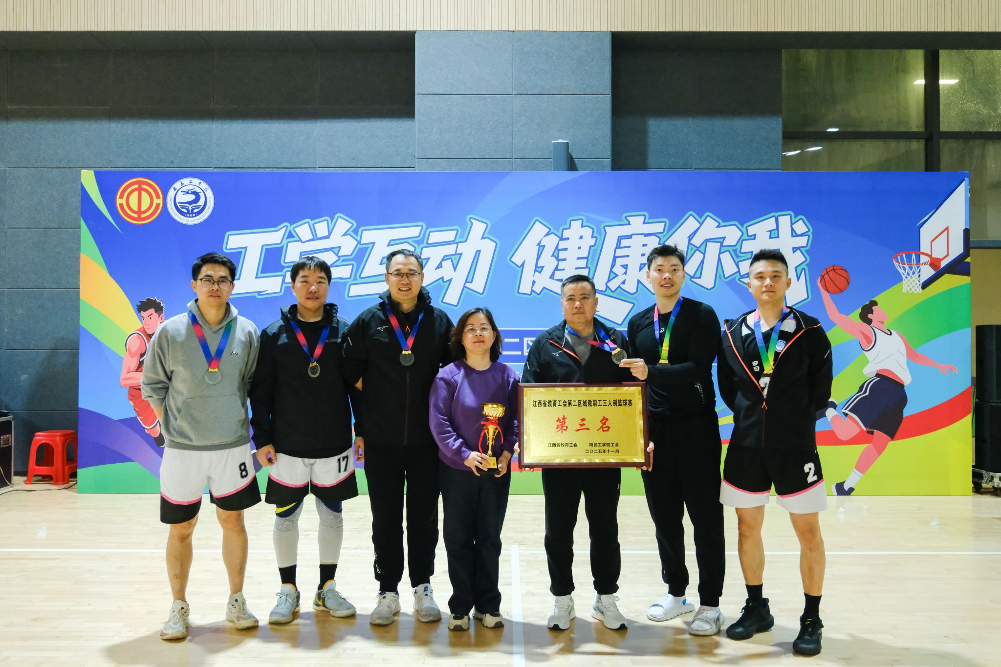 11月15日,2025年江西省教育工会第二区域教职工三人制篮球赛在南昌工学院落下帷幕。南昌大学教职工篮球队在强手如林的激烈角逐中,凭借顽强的意志和出色的团队协作,历经六场鏖战,最终以4胜2负的成绩,勇夺赛事第三名。本次比赛汇聚了区域内多支高校劲旅,竞争异常激烈。赛程密集,挑战严峻,我校队员们一天之内连续参加了6场高强度对决。这不仅是对队员体能极限的考验,更是对意志品质的锤炼。赛场上,队员们全情投入,在精妙的团队配合与默契的战术跑位中挥洒汗水与智慧,...