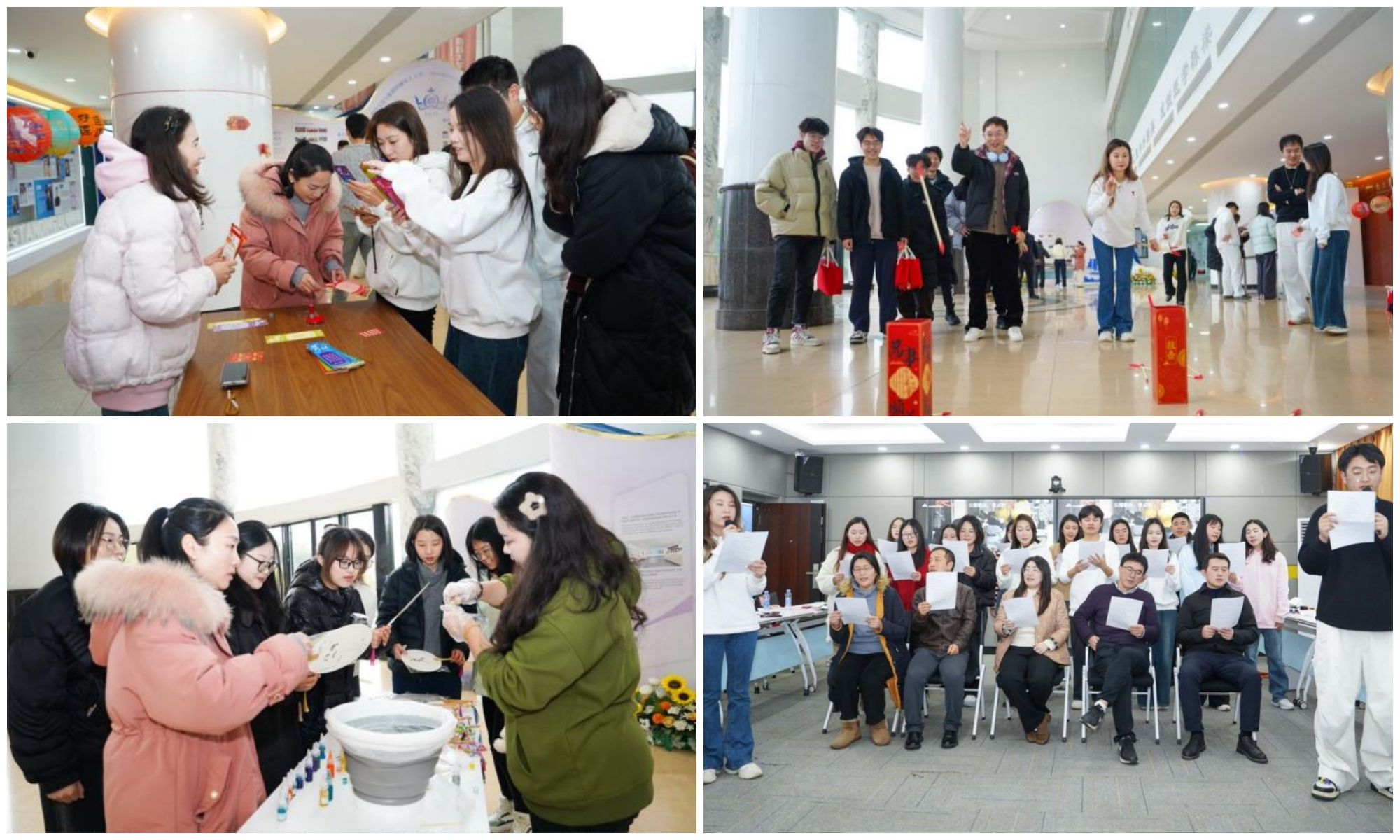 1月26日上午,传统文化体验日游园会率先拉开帷幕。活动设置了猜灯谜、投壶、漆扇DIY三项传统体验项目,让教职工沉浸式感受中华优秀传统文化魅力。猜灯谜区域,五彩灯笼下悬挂着涵盖诗词典故、生活常识的趣味谜题,教职工们或驻足思索,或相互探讨,气氛热烈融洽。投壶场地前,参与者们凝神静气、瞄准投掷,箭矢入壶引来阵阵喝彩,大家在轻松竞技中感受传统民俗乐趣。漆扇DIY环节人气爆棚,大家发挥创意,勾勒线条、调配色彩,将新春祝福融入扇面,亲手打造专属纪念品。整个游园会现场欢声笑语不断,在互动中增进了情谊,传承了文化。