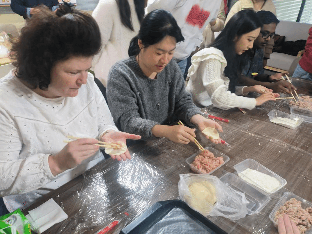 包饺子环节作为活动的“重头戏”。中方教师化身“文化使者”,耐心向英方外教讲解冬至吃饺子的民俗渊源和趣味俗语,让外教老师们听得津津有味。从对面皮的力度把控,到调馅包捏的技巧要领,中方教师手把手教学,外教老师则兴致勃勃地尝试,虽然包出的饺子形状各异,有“元宝形”“月牙形”甚至“创意形状”,但每一个都承载着满满的用心。
